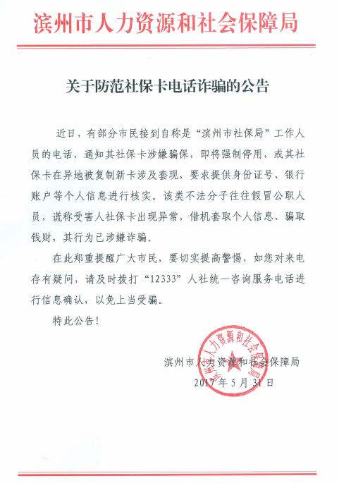 友情广而告之:关于防范社保卡电话诈骗的公告