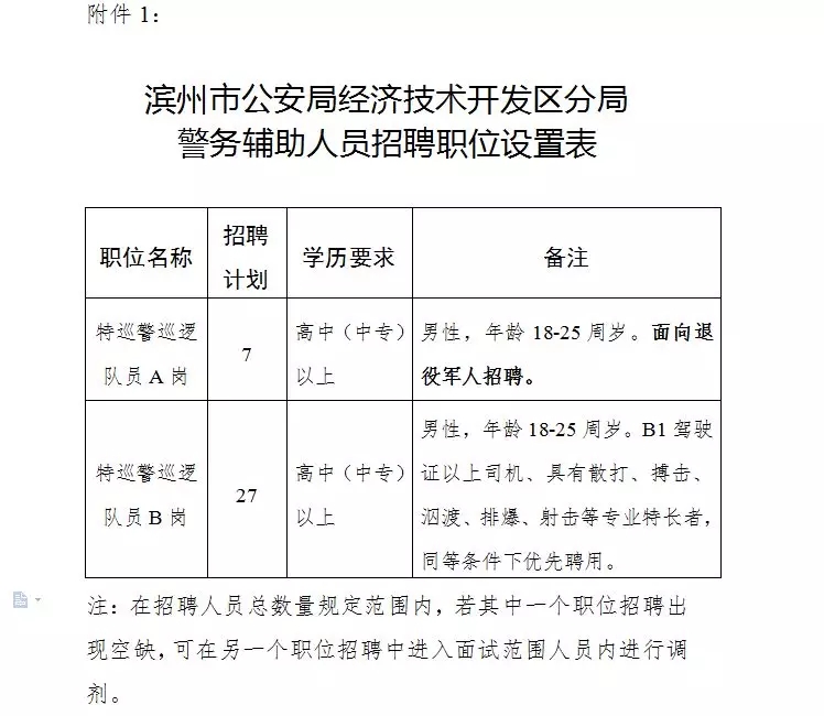 招聘职位及要求详见《滨州市公安局经济技术开发区分局警务辅助人员招聘职位设置表》(附件1)。